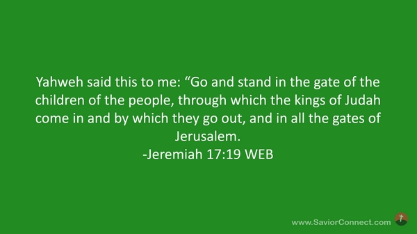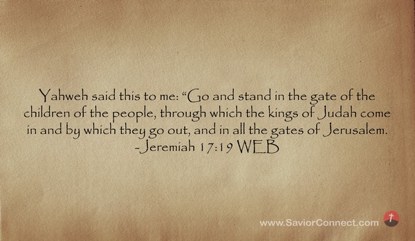 Yahweh said this to me: “Go and stand in the gate of the children of the people, through which the kings of Judah come in and by which they go out, and in all the gates of Jerusalem. -Jeremiah 17:19 WEB