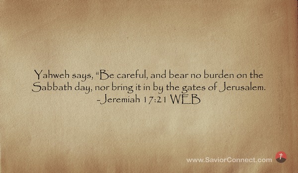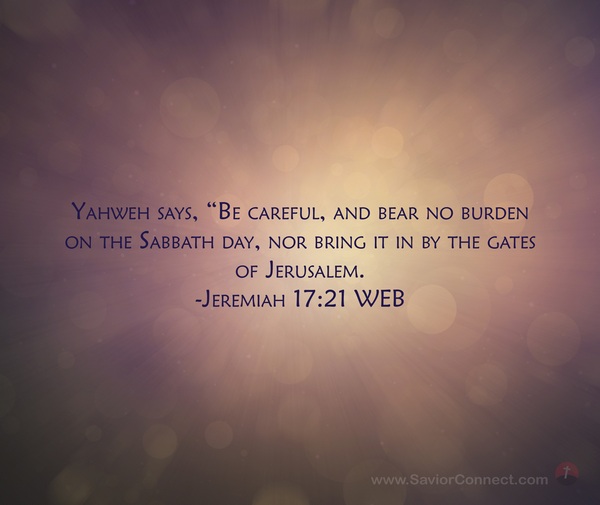 Yahweh says, “Be careful, and bear no burden on the Sabbath day, nor bring it in by the gates of Jerusalem. -Jeremiah 17:21 WEB
