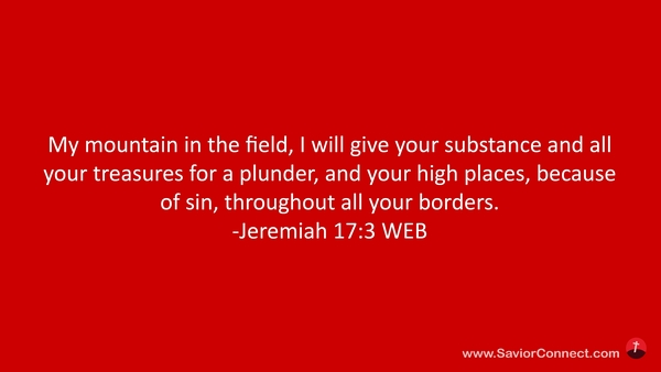 My mountain in the field, I will give your substance and all your treasures for a plunder, and your high places, because of sin, throughout all your borders. -Jeremiah 17:3 WEB