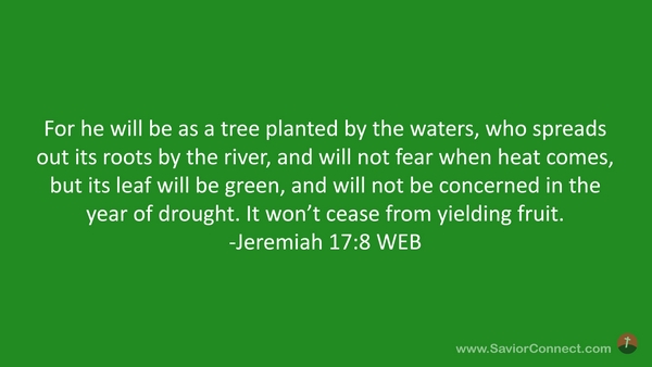 For he will be as a tree planted by the waters, who spreads out its roots by the river, and will not fear when heat comes, but its leaf will be green, and will not be concerned in the year of drought. It won’t cease from yielding fruit. -Jeremiah 17:8 WEB