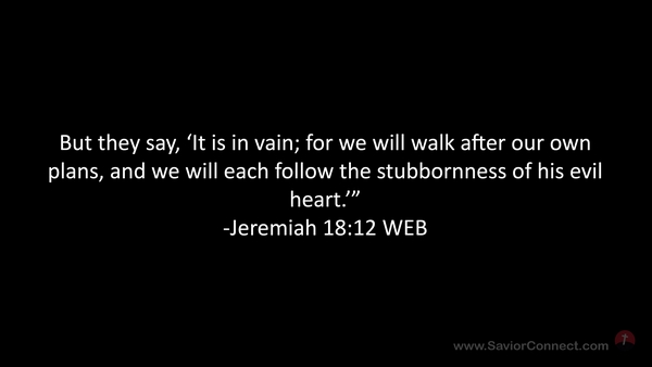 But they say, 'It is in vain; for we will walk after our own plans, and we will each follow the stubbornness of his evil heart.’” -Jeremiah 18:12 WEB