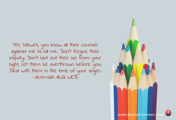 Yet, Yahweh, you know all their counsel against me to kill me. Don’t forgive their iniquity. Don’t blot out their sin from your sight, Let them be overthrown before you. Deal with them in the time of your anger. -Jeremiah 18:23 WEB