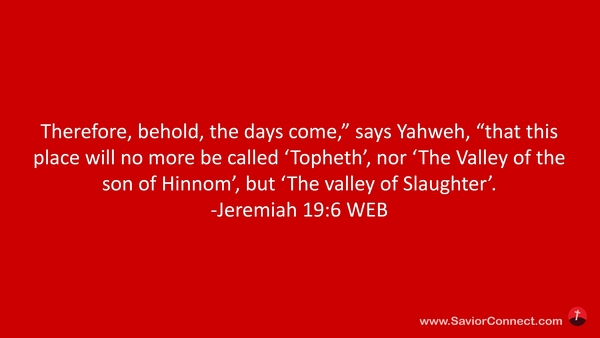 Therefore, behold, the days come,” says Yahweh, “that this place will no more be called 'Topheth’, nor 'The Valley of the son of Hinnom’, but 'The valley of Slaughter’. -Jeremiah 19:6 WEB