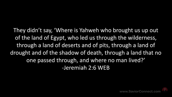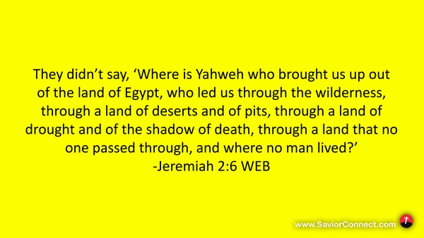 They didn’t say, 'Where is Yahweh who brought us up out of the land of Egypt, who led us through the wilderness, through a land of deserts and of pits, through a land of drought and of the shadow of death, through a land that no one passed through, and where no man lived?’ -Jeremiah 2:6 WEB