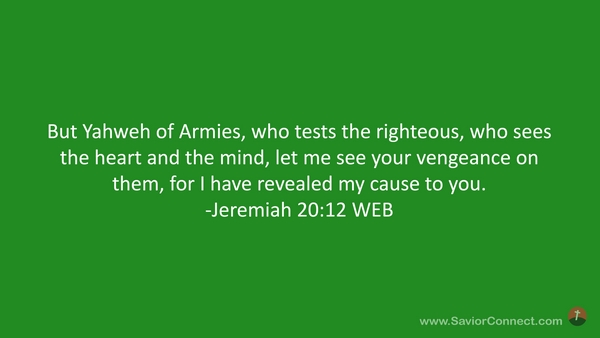 But Yahweh of Armies, who tests the righteous, who sees the heart and the mind, let me see your vengeance on them, for I have revealed my cause to you. -Jeremiah 20:12 WEB
