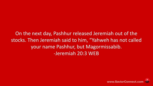 On the next day, Pashhur released Jeremiah out of the stocks. Then Jeremiah said to him, “Yahweh has not called your name Pashhur, but Magormissabib. -Jeremiah 20:3 WEB