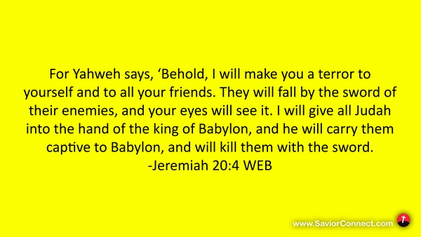 For Yahweh says, 'Behold, I will make you a terror to yourself and to all your friends. They will fall by the sword of their enemies, and your eyes will see it. I will give all Judah into the hand of the king of Babylon, and he will carry them captive to Babylon, and will kill them with the sword. -Jeremiah 20:4 WEB