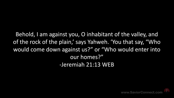 Behold, I am against you, O inhabitant of the valley, and of the rock of the plain,’ says Yahweh. 'You that say, “Who would come down against us?” or “Who would enter into our homes?” -Jeremiah 21:13 WEB