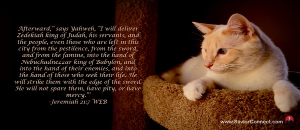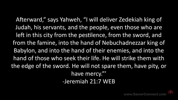 Afterward,” says Yahweh, “I will deliver Zedekiah king of Judah, his servants, and the people, even those who are left in this city from the pestilence, from the sword, and from the famine, into the hand of Nebuchadnezzar king of Babylon, and into the hand of their enemies, and into the hand of those who seek their life. He will strike them with the edge of the sword. He will not spare them, have pity, or have mercy.”’ -Jeremiah 21:7 WEB