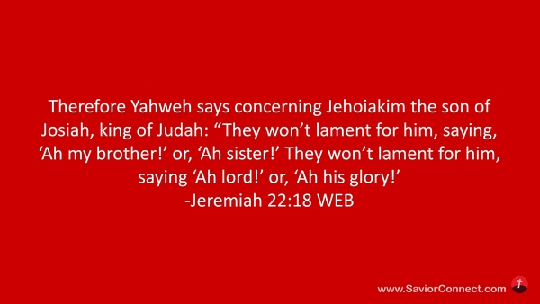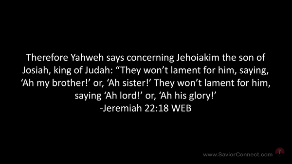 Therefore Yahweh says concerning Jehoiakim the son of Josiah, king of Judah: “They won’t lament for him, saying, 'Ah my brother!’ or, 'Ah sister!’ They won’t lament for him, saying 'Ah lord!’ or, 'Ah his glory!’ -Jeremiah 22:18 WEB