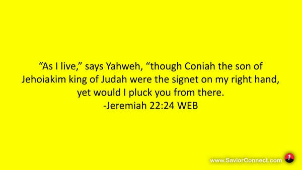 “As I live,” says Yahweh, “though Coniah the son of Jehoiakim king of Judah were the signet on my right hand, yet would I pluck you from there. -Jeremiah 22:24 WEB