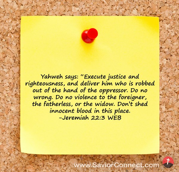 Yahweh says: “Execute justice and righteousness, and deliver him who is robbed out of the hand of the oppressor. Do no wrong. Do no violence to the foreigner, the fatherless, or the widow. Don’t shed innocent blood in this place. -Jeremiah 22:3 WEB