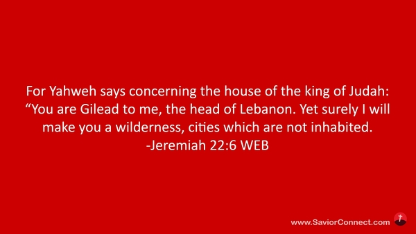 For Yahweh says concerning the house of the king of Judah: “You are Gilead to me, the head of Lebanon. Yet surely I will make you a wilderness, cities which are not inhabited. -Jeremiah 22:6 WEB