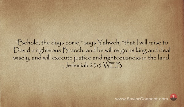 “Behold, the days come,” says Yahweh, “that I will raise to David a righteous Branch, and he will reign as king and deal wisely, and will execute justice and righteousness in the land. -Jeremiah 23:5 WEB