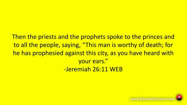 Then the priests and the prophets spoke to the princes and to all the people, saying, “This man is worthy of death; for he has prophesied against this city, as you have heard with your ears.” -Jeremiah 26:11 WEB