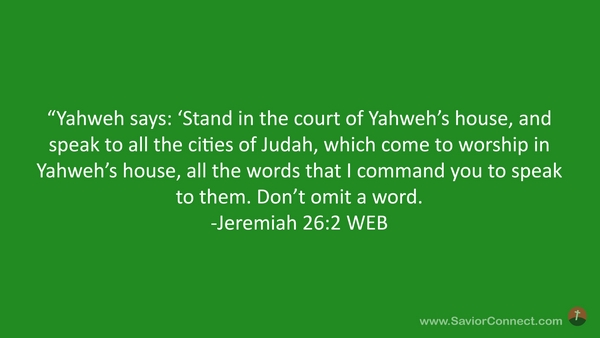 “Yahweh says: 'Stand in the court of Yahweh’s house, and speak to all the cities of Judah, which come to worship in Yahweh’s house, all the words that I command you to speak to them. Don’t omit a word. -Jeremiah 26:2 WEB