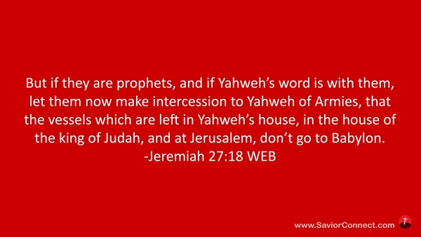 But if they are prophets, and if Yahweh’s word is with them, let them now make intercession to Yahweh of Armies, that the vessels which are left in Yahweh’s house, in the house of the king of Judah, and at Jerusalem, don’t go to Babylon. -Jeremiah 27:18 WEB
