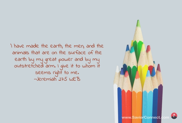 'I have made the earth, the men, and the animals that are on the surface of the earth by my great power and by my outstretched arm. I give it to whom it seems right to me. -Jeremiah 27:5 WEB