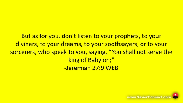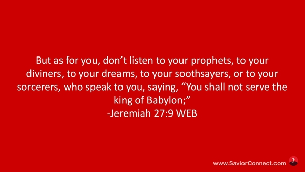 But as for you, don’t listen to your prophets, to your diviners, to your dreams, to your soothsayers, or to your sorcerers, who speak to you, saying, “You shall not serve the king of Babylon;” -Jeremiah 27:9 WEB