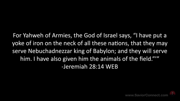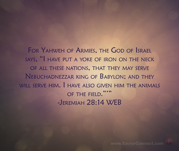 For Yahweh of Armies, the God of Israel says, “I have put a yoke of iron on the neck of all these nations, that they may serve Nebuchadnezzar king of Babylon; and they will serve him. I have also given him the animals of the field.”’” -Jeremiah 28:14 WEB
