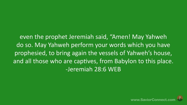 even the prophet Jeremiah said, “Amen! May Yahweh do so. May Yahweh perform your words which you have prophesied, to bring again the vessels of Yahweh’s house, and all those who are captives, from Babylon to this place. -Jeremiah 28:6 WEB