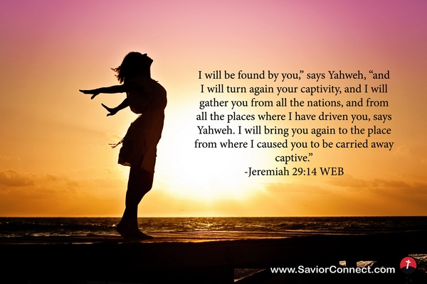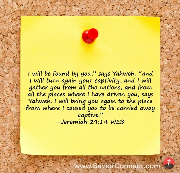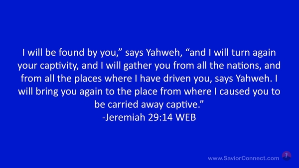 I will be found by you,” says Yahweh, “and I will turn again your captivity, and I will gather you from all the nations, and from all the places where I have driven you, says Yahweh. I will bring you again to the place from where I caused you to be carried away captive.” -Jeremiah 29:14 WEB
