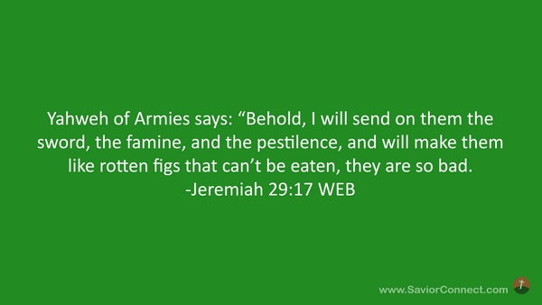 Yahweh of Armies says: “Behold, I will send on them the sword, the famine, and the pestilence, and will make them like rotten figs that can’t be eaten, they are so bad. -Jeremiah 29:17 WEB