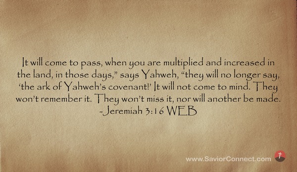It will come to pass, when you are multiplied and increased in the land, in those days,” says Yahweh, “they will no longer say, 'the ark of Yahweh’s covenant!’ It will not come to mind. They won’t remember it. They won’t miss it, nor will another be made. -Jeremiah 3:16 WEB