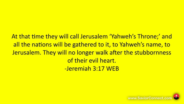 At that time they will call Jerusalem 'Yahweh’s Throne;’ and all the nations will be gathered to it, to Yahweh’s name, to Jerusalem. They will no longer walk after the stubbornness of their evil heart. -Jeremiah 3:17 WEB
