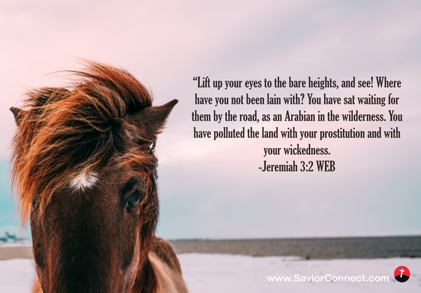 “Lift up your eyes to the bare heights, and see! Where have you not been lain with? You have sat waiting for them by the road, as an Arabian in the wilderness. You have polluted the land with your prostitution and with your wickedness. -Jeremiah 3:2 WEB