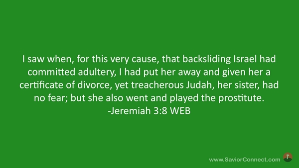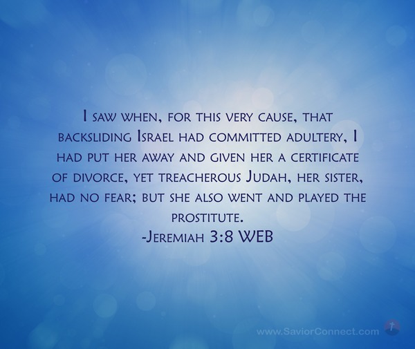 I saw when, for this very cause, that backsliding Israel had committed adultery, I had put her away and given her a certificate of divorce, yet treacherous Judah, her sister, had no fear; but she also went and played the prostitute. -Jeremiah 3:8 WEB