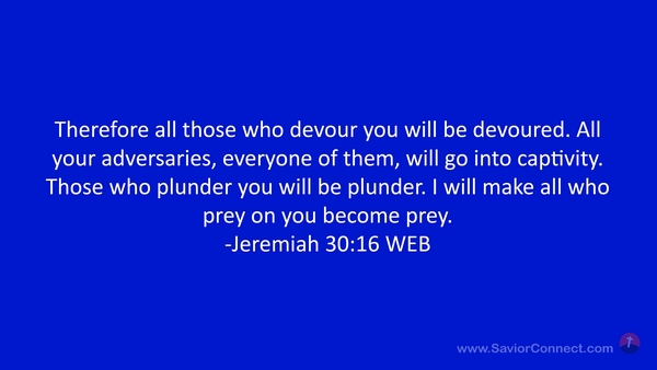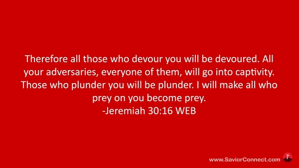 Therefore all those who devour you will be devoured. All your adversaries, everyone of them, will go into captivity. Those who plunder you will be plunder. I will make all who prey on you become prey. -Jeremiah 30:16 WEB