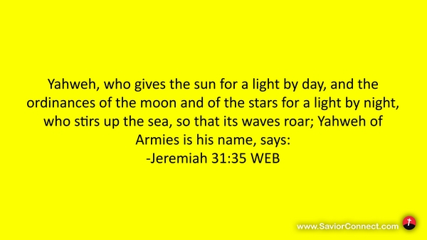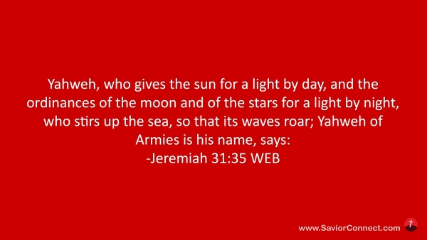 Yahweh, who gives the sun for a light by day, and the ordinances of the moon and of the stars for a light by night, who stirs up the sea, so that its waves roar; Yahweh of Armies is his name, says: -Jeremiah 31:35 WEB