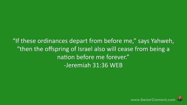 “If these ordinances depart from before me,” says Yahweh, “then the offspring of Israel also will cease from being a nation before me forever.” -Jeremiah 31:36 WEB