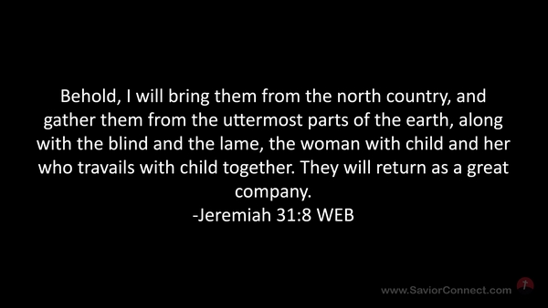 Behold, I will bring them from the north country, and gather them from the uttermost parts of the earth, along with the blind and the lame, the woman with child and her who travails with child together. They will return as a great company. -Jeremiah 31:8 WEB
