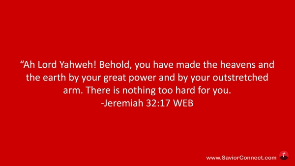“Ah Lord Yahweh! Behold, you have made the heavens and the earth by your great power and by your outstretched arm. There is nothing too hard for you. -Jeremiah 32:17 WEB