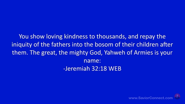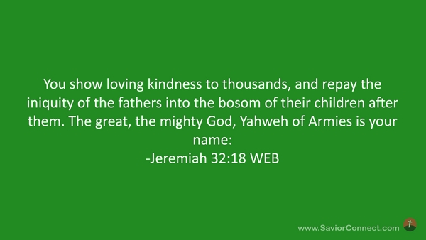 You show loving kindness to thousands, and repay the iniquity of the fathers into the bosom of their children after them. The great, the mighty God, Yahweh of Armies is your name: -Jeremiah 32:18 WEB
