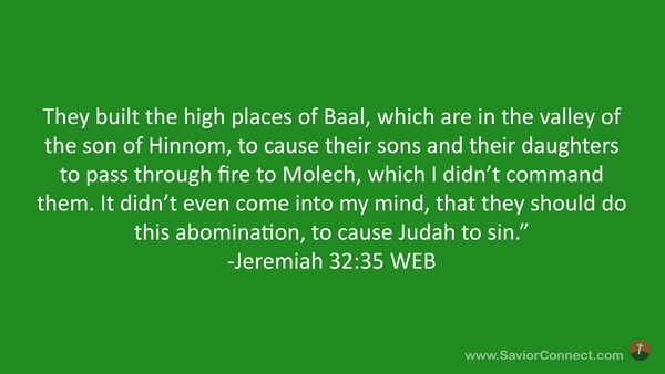 They built the high places of Baal, which are in the valley of the son of Hinnom, to cause their sons and their daughters to pass through fire to Molech, which I didn’t command them. It didn’t even come into my mind, that they should do this abomination, to cause Judah to sin.” -Jeremiah 32:35 WEB