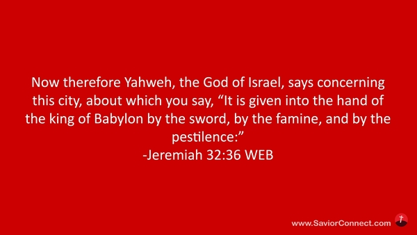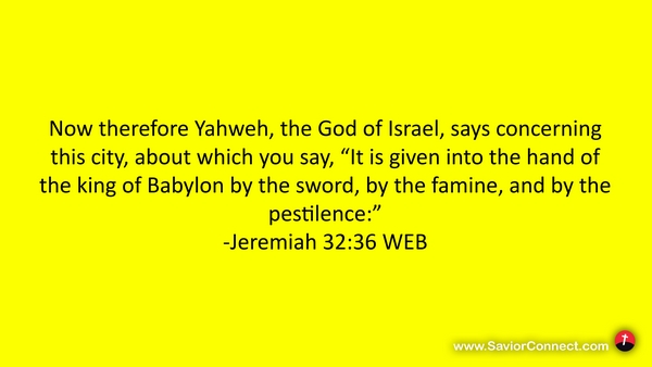 Now therefore Yahweh, the God of Israel, says concerning this city, about which you say, “It is given into the hand of the king of Babylon by the sword, by the famine, and by the pestilence:” -Jeremiah 32:36 WEB