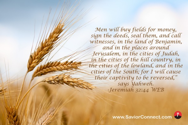 Men will buy fields for money, sign the deeds, seal them, and call witnesses, in the land of Benjamin, and in the places around Jerusalem, in the cities of Judah, in the cities of the hill country, in the cities of the lowland, and in the cities of the South; for I will cause their captivity to be reversed,” says Yahweh. -Jeremiah 32:44 WEB