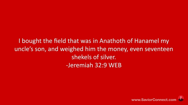 I bought the field that was in Anathoth of Hanamel my uncle’s son, and weighed him the money, even seventeen shekels of silver. -Jeremiah 32:9 WEB