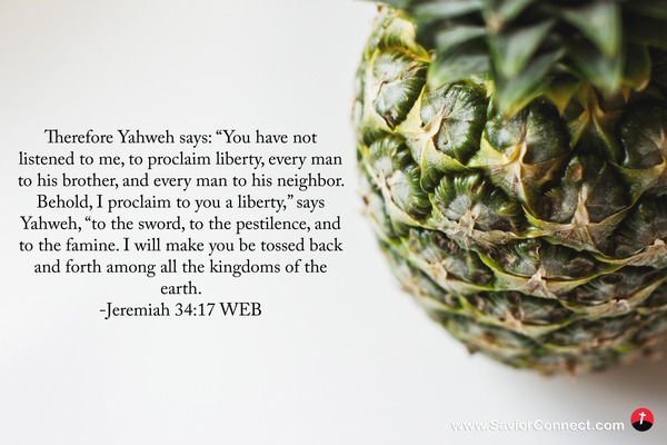 Therefore Yahweh says: “You have not listened to me, to proclaim liberty, every man to his brother, and every man to his neighbor. Behold, I proclaim to you a liberty,” says Yahweh, “to the sword, to the pestilence, and to the famine. I will make you be tossed back and forth among all the kingdoms of the earth. -Jeremiah 34:17 WEB