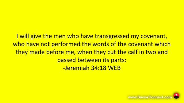 I will give the men who have transgressed my covenant, who have not performed the words of the covenant which they made before me, when they cut the calf in two and passed between its parts: -Jeremiah 34:18 WEB