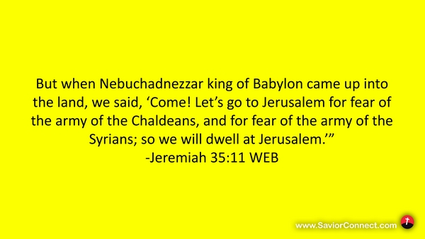 But when Nebuchadnezzar king of Babylon came up into the land, we said, 'Come! Let’s go to Jerusalem for fear of the army of the Chaldeans, and for fear of the army of the Syrians; so we will dwell at Jerusalem.’” -Jeremiah 35:11 WEB