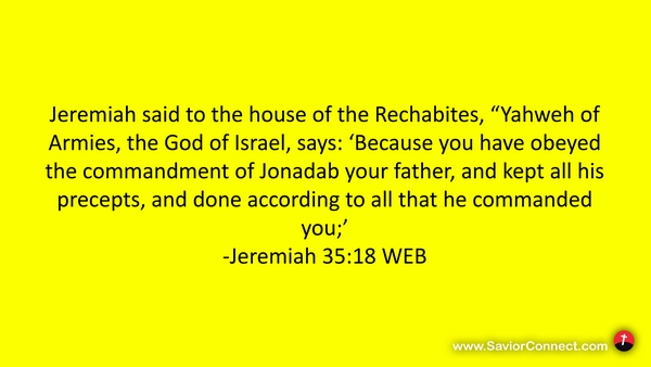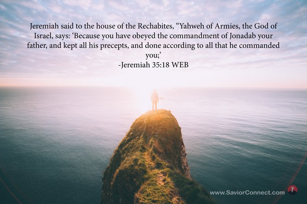 Jeremiah said to the house of the Rechabites, “Yahweh of Armies, the God of Israel, says: 'Because you have obeyed the commandment of Jonadab your father, and kept all his precepts, and done according to all that he commanded you;’ -Jeremiah 35:18 WEB