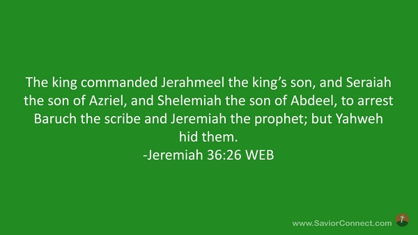 The king commanded Jerahmeel the king’s son, and Seraiah the son of Azriel, and Shelemiah the son of Abdeel, to arrest Baruch the scribe and Jeremiah the prophet; but Yahweh hid them. -Jeremiah 36:26 WEB