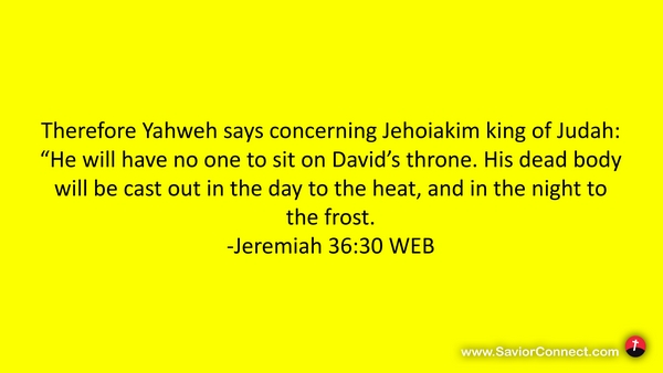 Therefore Yahweh says concerning Jehoiakim king of Judah: “He will have no one to sit on David’s throne. His dead body will be cast out in the day to the heat, and in the night to the frost. -Jeremiah 36:30 WEB