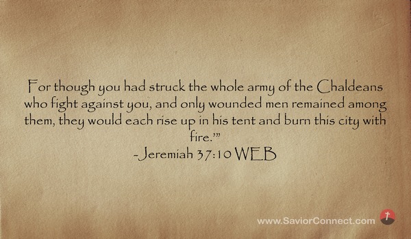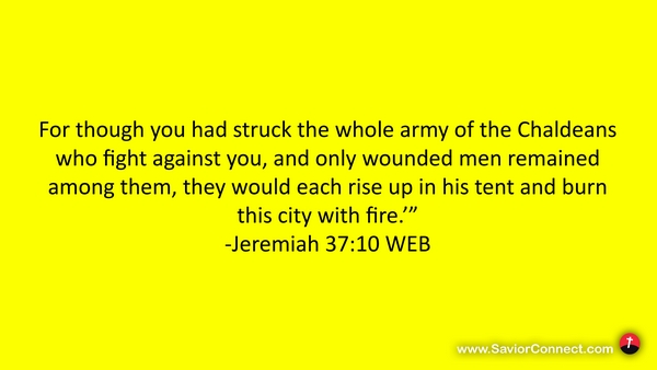 For though you had struck the whole army of the Chaldeans who fight against you, and only wounded men remained among them, they would each rise up in his tent and burn this city with fire.’” -Jeremiah 37:10 WEB