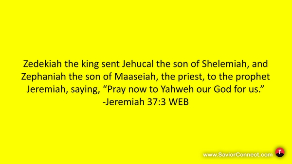 Zedekiah the king sent Jehucal the son of Shelemiah, and Zephaniah the son of Maaseiah, the priest, to the prophet Jeremiah, saying, “Pray now to Yahweh our God for us.” -Jeremiah 37:3 WEB