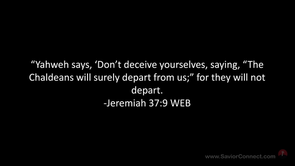 “Yahweh says, 'Don’t deceive yourselves, saying, “The Chaldeans will surely depart from us;” for they will not depart. -Jeremiah 37:9 WEB